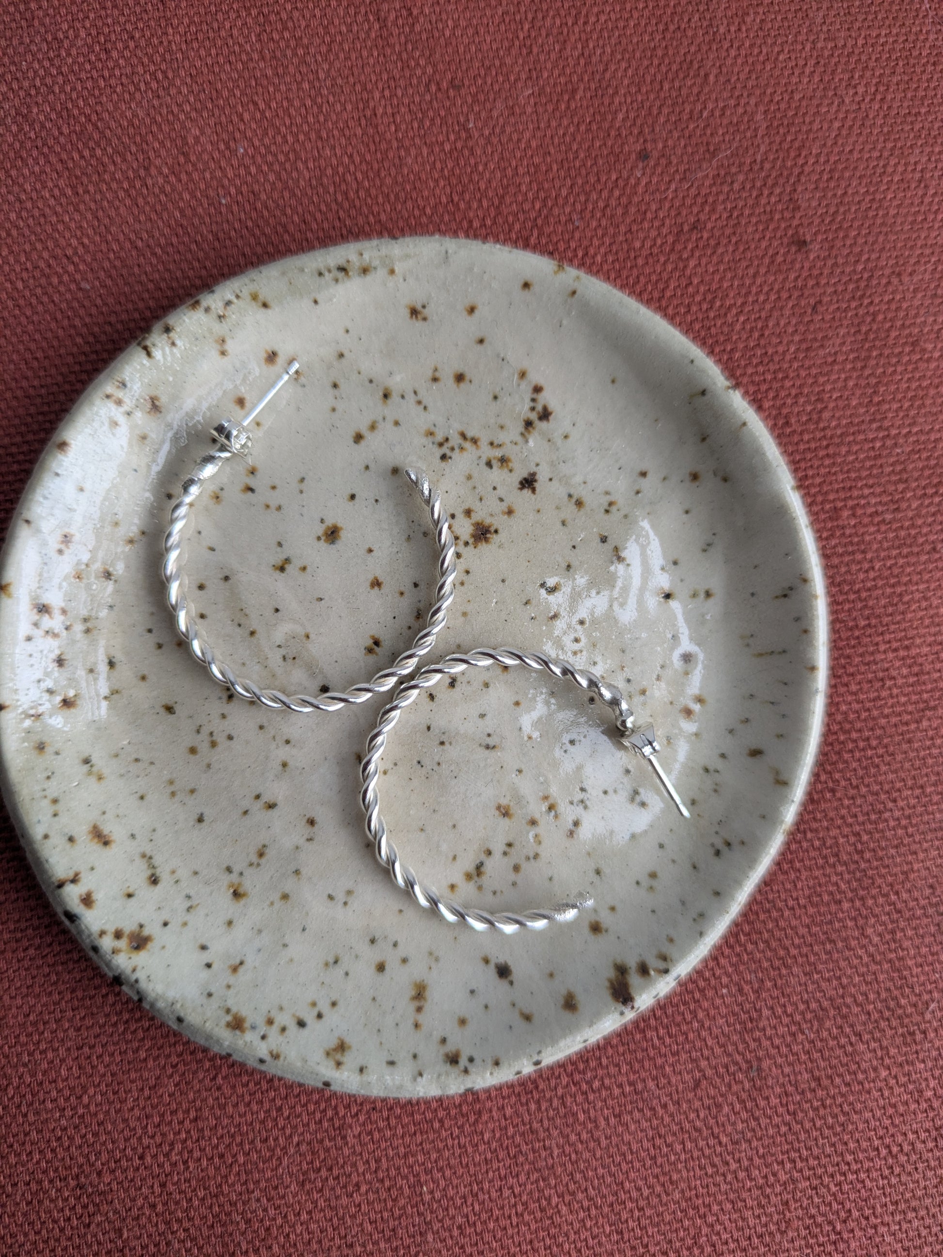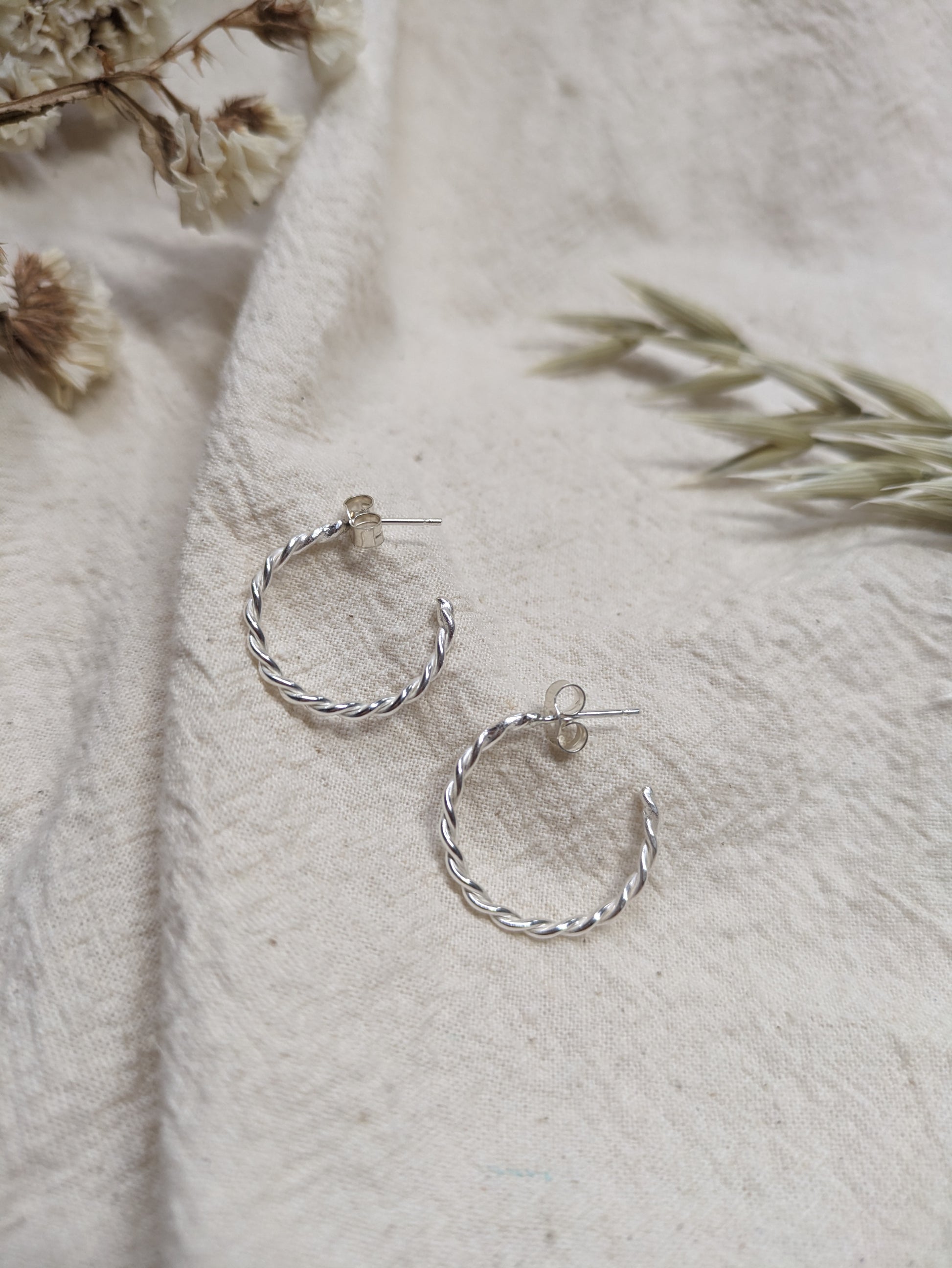 Rope Hoops made of two strands of twisted sterling silver. Inspired by Welsh love spoons, these earrings come in two sizes for versatile wear. Add a touch of elegance and culture to any outfit with these unique and eye-catching hoops. Made with 100% recycled sterling silver, these gorgeous hoops are made by myself in my Cardiff studio.