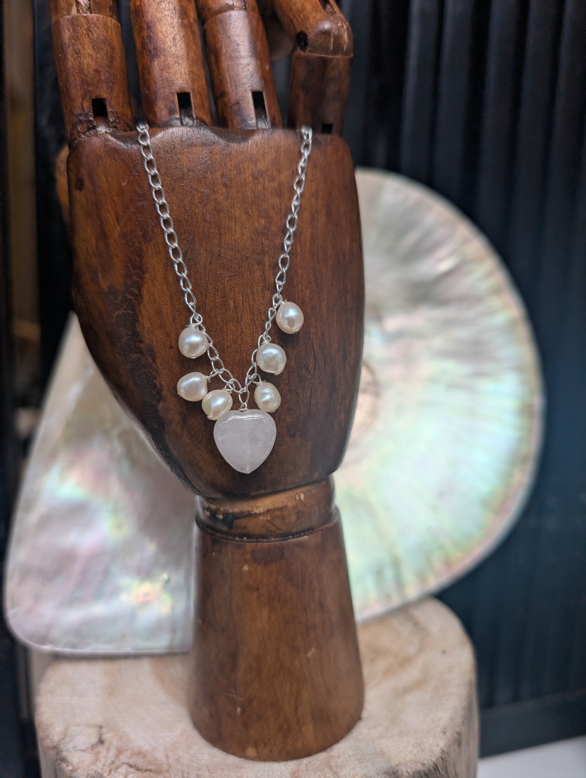 Dainty 2mm rose quartz heart surrounded by freshwater pearls, each hand wrapped with sterling silver wire and on a 10 inch adjustable sterling silver chain