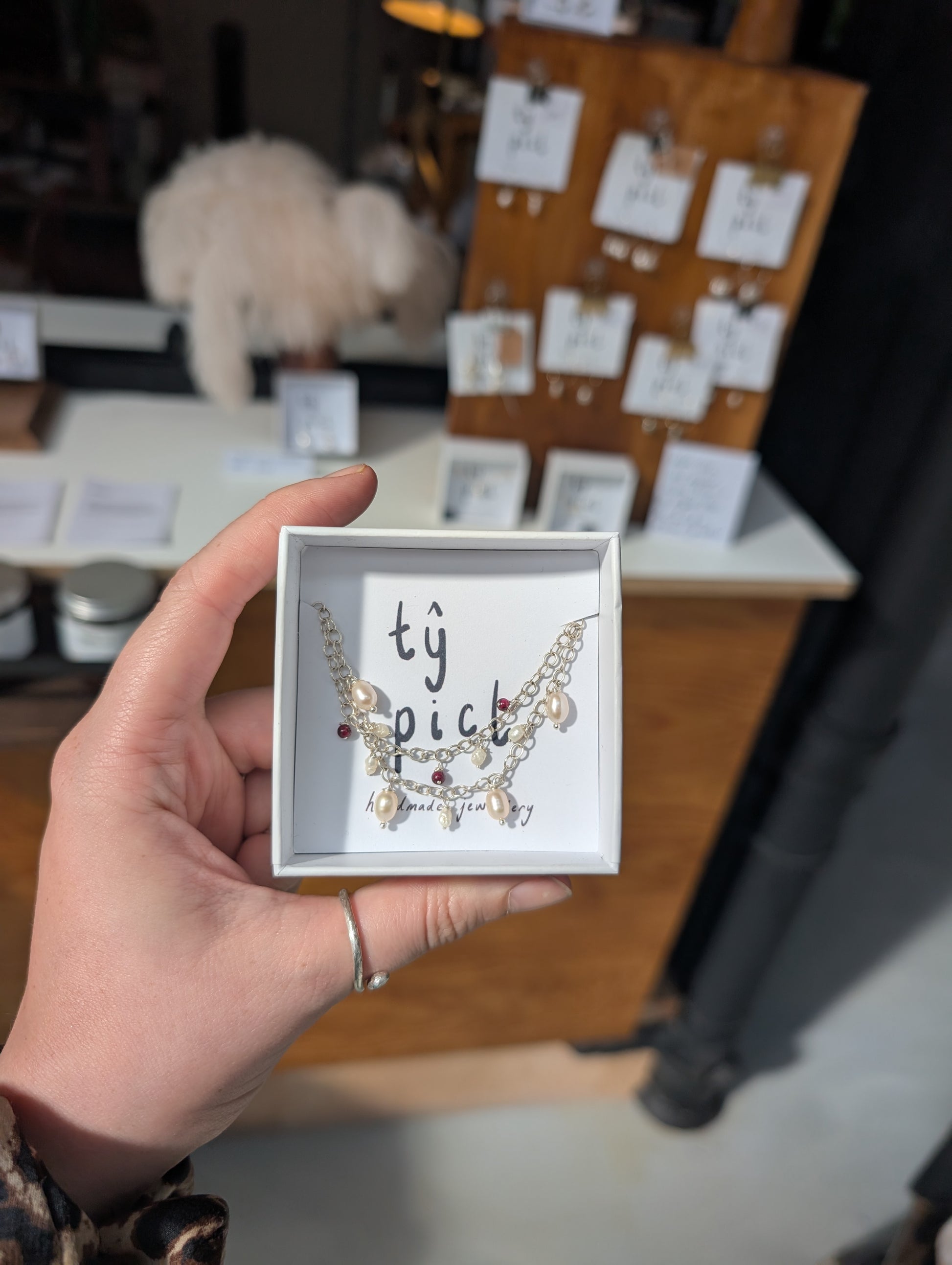 The perfect statement choker, this is such a a beautiful piece dripping with garnets and freshwater pearls each wrapped by hand with 100% recycled sterling silver. The chain sits at 15 inches but can be adjusted to any position as the links allow adjustment