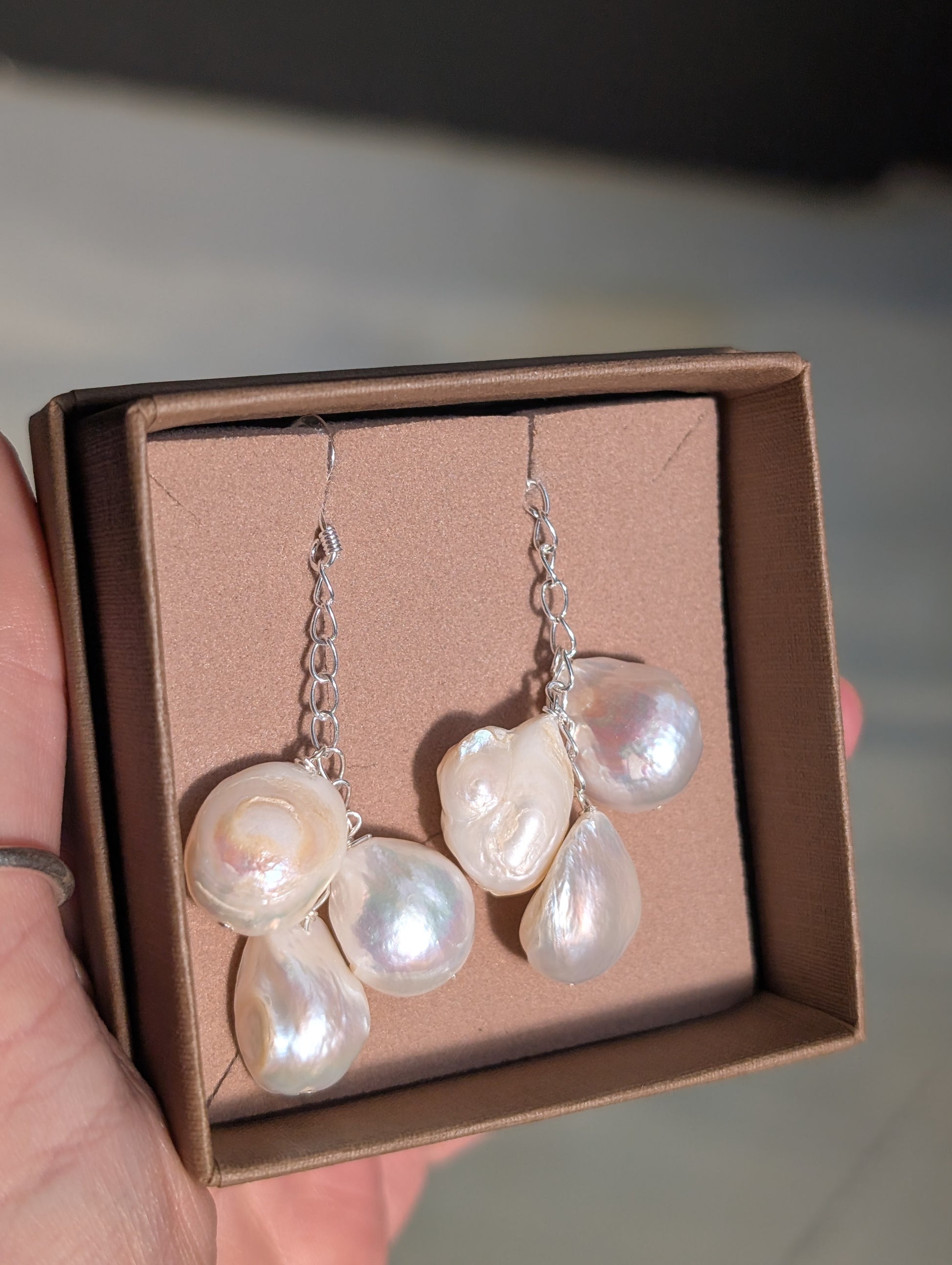 These statement freshwater pearl earrings feature a durable sterling silver hook, ensuring secure wear. The natural luster of the pearls provides a sophisticated aesthetic, making them suitable for both formal and casual occasions. Their substantial size enhances visibility, making a noteworthy addition to any jewelry collection.
