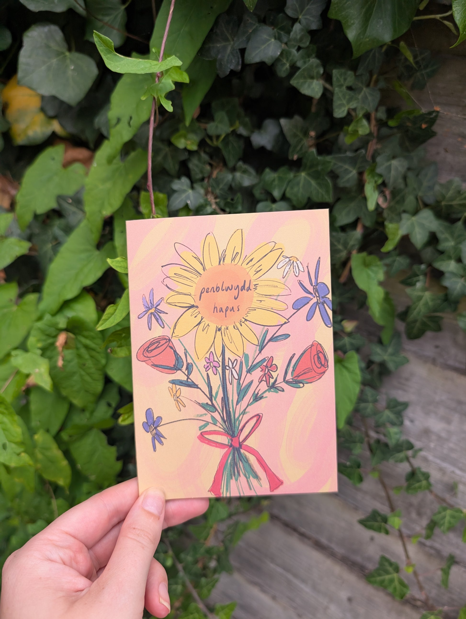 A cheerful Welsh birthday card, illustrated with a hand-drawn bouquet and the words *“Penblwydd Hapus”* (Happy Birthday) in the centre of a sunflower.